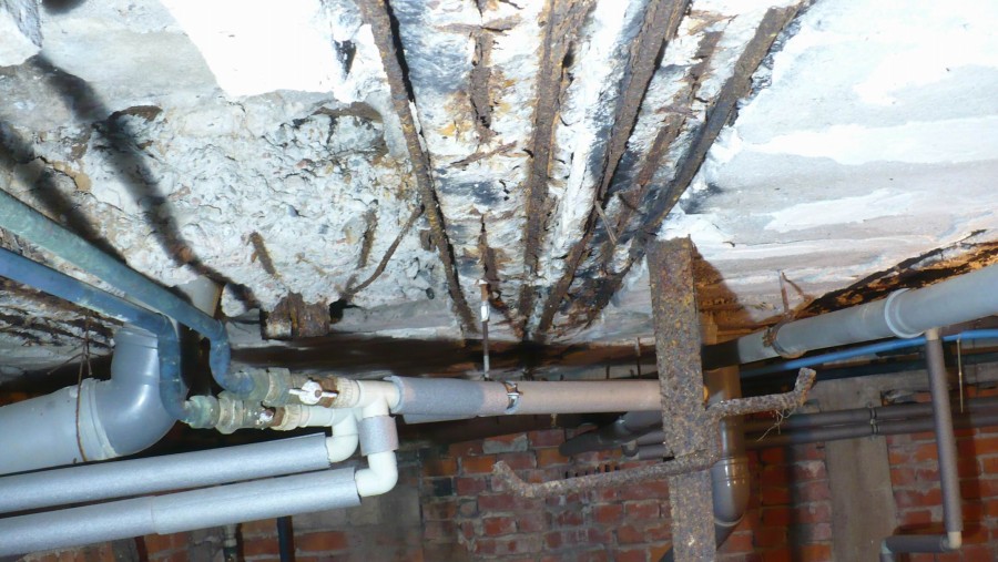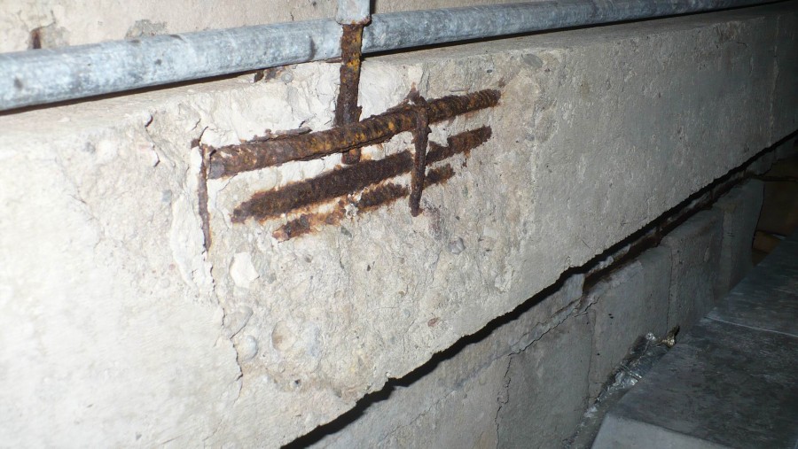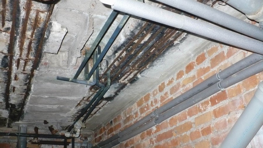 Ekspertyza konstrukcyjna stropu nad piwnicą. Silnie korozyjne środowisko, słaba jakość wykonania elementów. Duża korozja elementów i zbrojenia. Ekspertyza konstrukcyjna z projektem zabezpieczenia.
